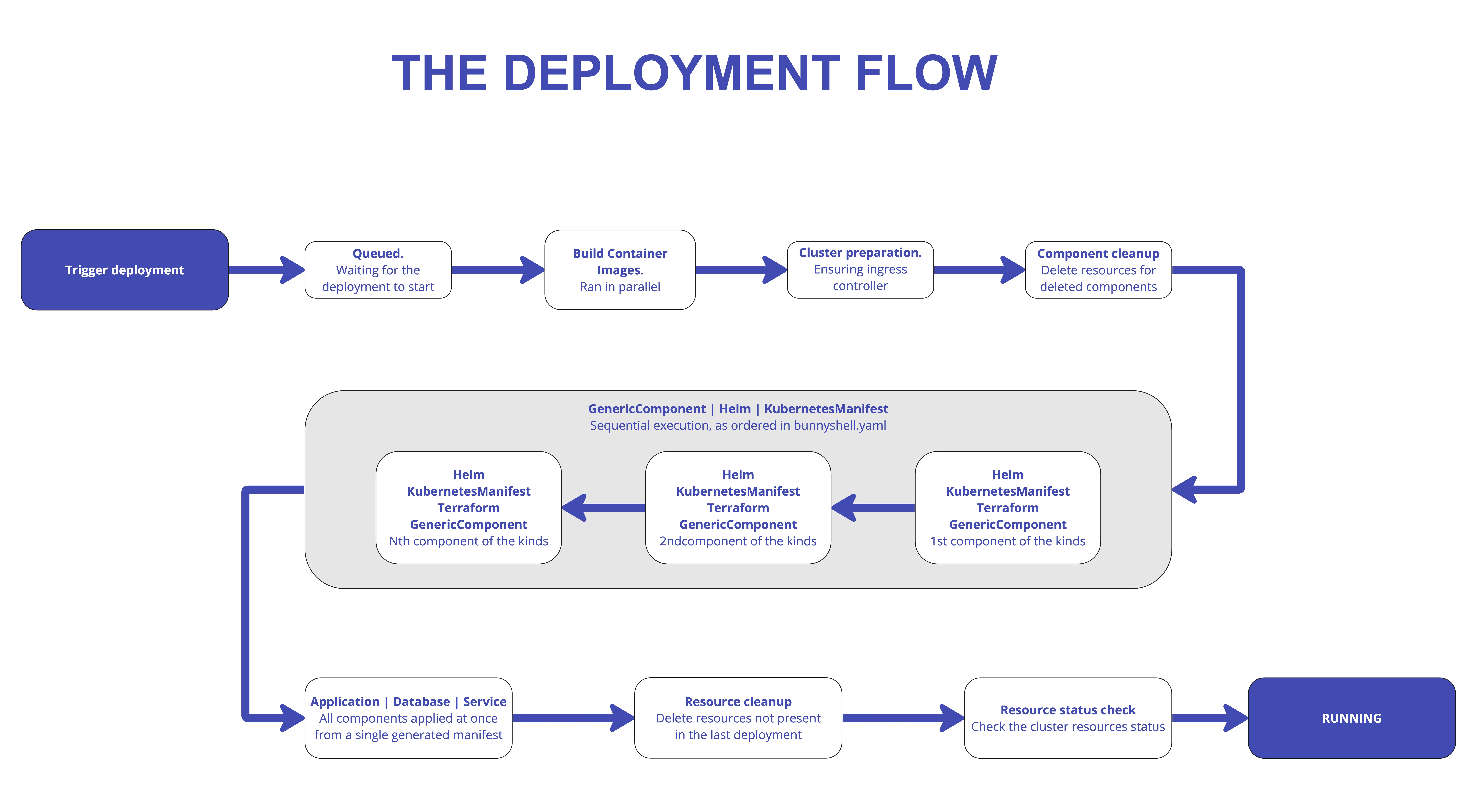 Helm components are defined and edited only from the bunnyshell.yaml file. Bunnyshell allows you to declare a set of bash commands to be ran when deploying, starting, stopping, or deleting the component.